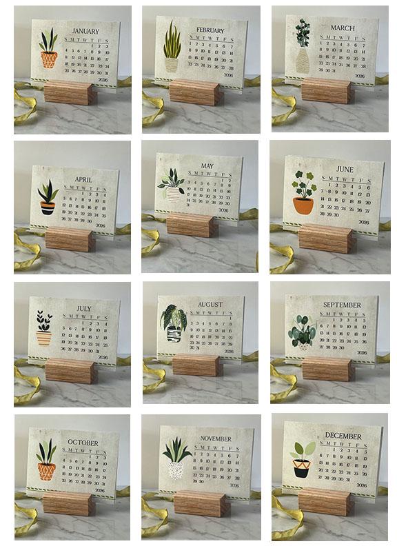 The 2026 calendar features graphic, colorful and fun houseplants in subtle containers. Each one is different but all are a natural, "green" design.